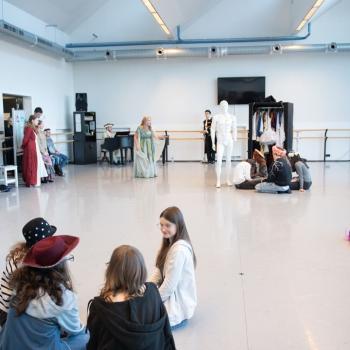 Stanoviště baletu DJKT - jeviště Nové scény tentokrát probíhalo přímo mezi muzikálovými kulisami, které si děti mohly prohlédnout zbízka.